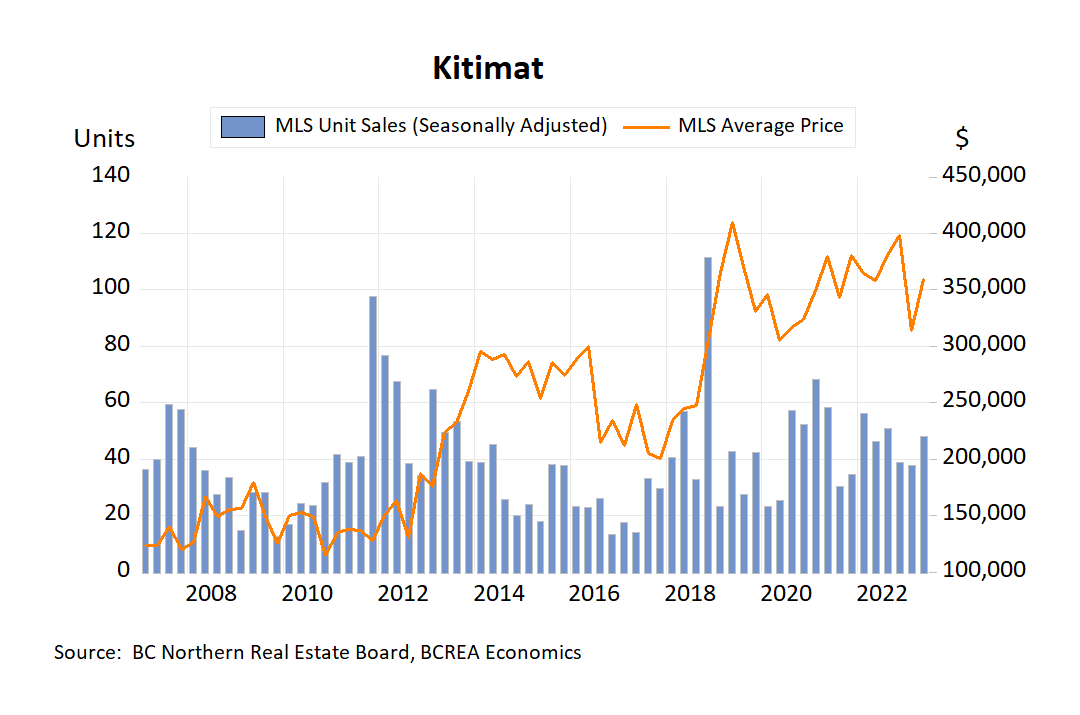 Kitimat: 148 properties worth $73.6 million have changed hands in the first nine months of 2023, compared to 167 properties worth $58.9 million to September 30, 2022. Of the 92 single-family homes sold so far this year, half sold for less than $375,000. These homes took, on average 71 days to sell. In addition, 22 half duplexes and 18 townhomes were also sold this year. At the end of September there were 115 properties of all types available through the MLS® in the Kitimat area.