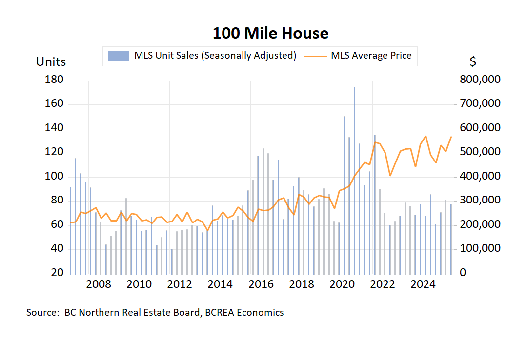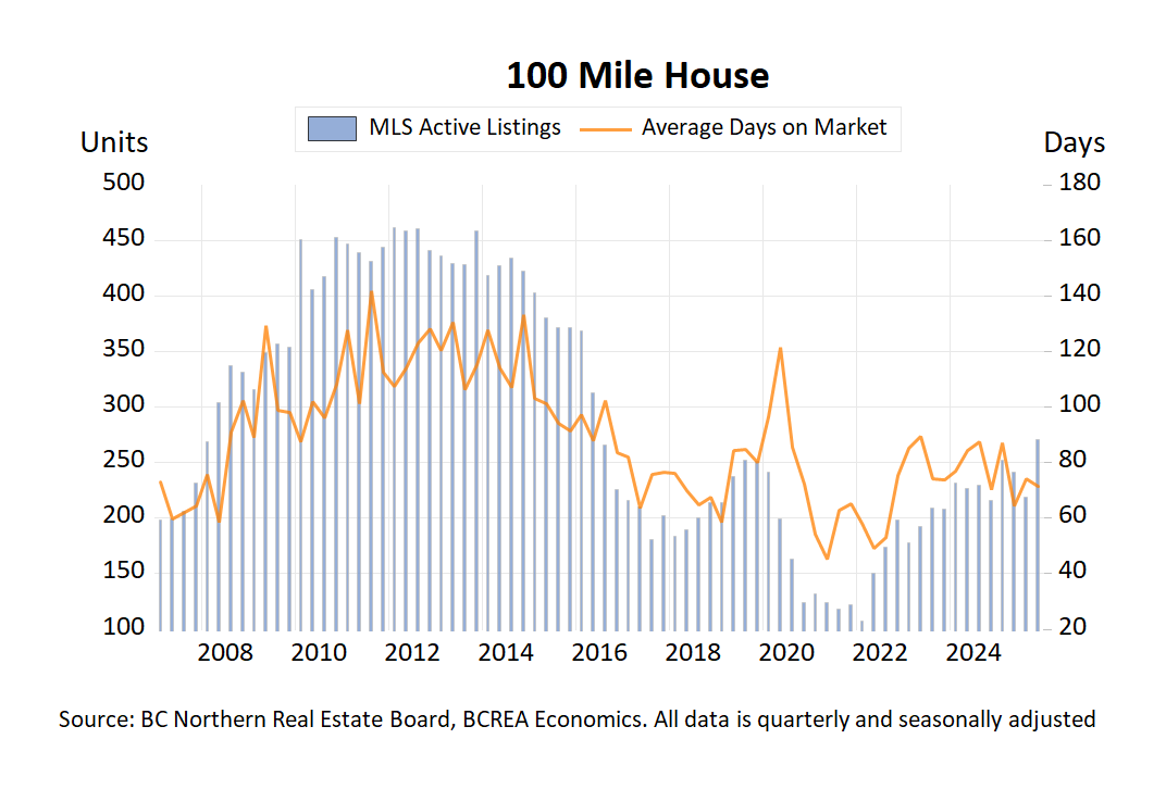 100 Mile House: 420 properties worth $188.4 million sold this year through MLS®, compared with 374 properties worth $175.1 million in 2024. The 125 single-family homes that sold in 2025 had a median value (half sold for less) of $515,000. In addition, 110 parcels of vacant land, 101 homes on acreage, 30 manufactured homes on land, 9 manufactured homes in parks, and 19 recreational properties changed hands in 2025. At the end of December, there were 278 properties of all types available for sale through MLS® in the 100 Mile House area, up from the 258 properties at the end of 2024.