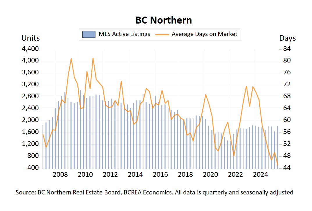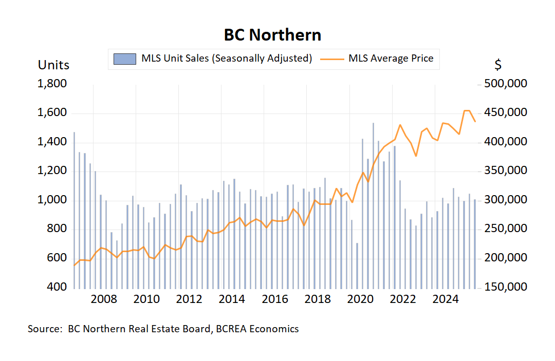 Sales in the BC Northern region in the fourth quarter of 2025 ticked downward from a close-to average previous quarter. At 1,008 sales on a seasonally adjusted basis, housing market activity was 4.2 per cent below historical averages and 7.2 per cent below the level of Q4 2024. With 1,811 active listings at the end of December 2025 (seasonally adjusted), the region remains about 30 per cent below what we consider healthy long-term levels of inventory. The average sale price in the board area fell to $436,495, 4.2 per cent below the previous quarter.