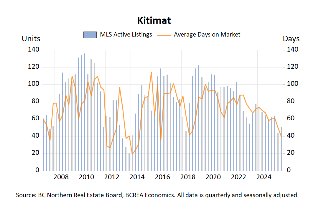 Kitimat: 164 properties worth $68.1 million changed hands in 2025 compared with 183 properties worth $67.6 million in 2024. The median value of the 122 single-family homes sold in 2025 was $419,500. In addition, 14 half-duplexes and 7 townhouses were sold. At year-end, there were 81 properties of all types available in the Kitimat area, which is down from 89 at December 31, 2024.