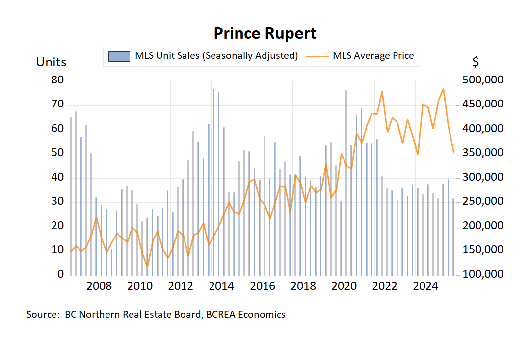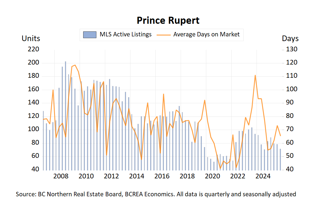 Prince Rupert: 159 properties worth $68.3 million changed hands in 2025 compared with 166 properties worth $65.4 million in 2024. Half of the 114 single-family homes sold in 2025 sold for less than $445,000. In addition, 10 parcels of vacant land, 4 homes on acreage, and 6 half-duplexes sold in 2025. At year-end, there were 121 properties of all types available through MLS® in the Prince Rupert area, up slightly from the 119 properties at the same time last year.