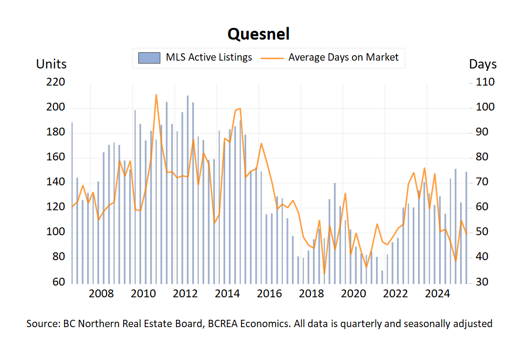 Quesnel: 345 properties changed hands in 2025 through MLS®, up from 313 that were sold in 2024. The value of these properties was $118.2 million ($112.8 million in 2024). The median value of the 120 single-family homes sold in 2025 was $375,000. In addition, 58 parcels of vacant land, 67 homes on acreage, 31 manufactured homes in parks and 39 manufactured homes on land were reported sold in 2025. At year-end, there were 162 properties of all types available for purchase through MLS® in the Quesnel area, up from 132 properties at the end of 2024.