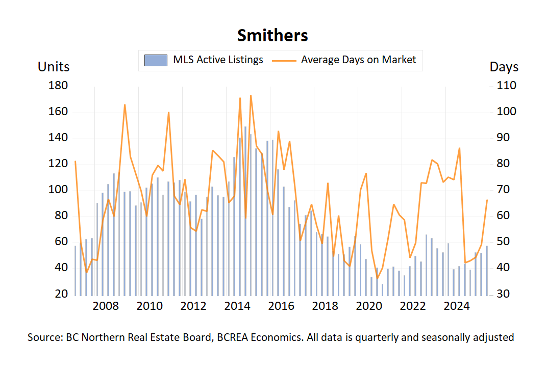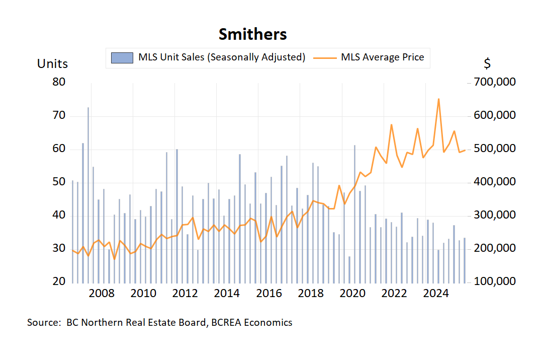 Smithers: REALTORS® reported 161 sales worth $85.9 million in 2025, compared to 160 sales worth $82.2 million in 2024. The median value of the 66 single-family homes that sold in 2025 was $517,500. 18 parcels of vacant land, 37 homes on acreage, 15 manufactured homes in parks and a further 4 on land also changed hands in 2025. At year-end, there were 80 properties of all types available in the Smithers area, compared with 53 at December 31, 2024.