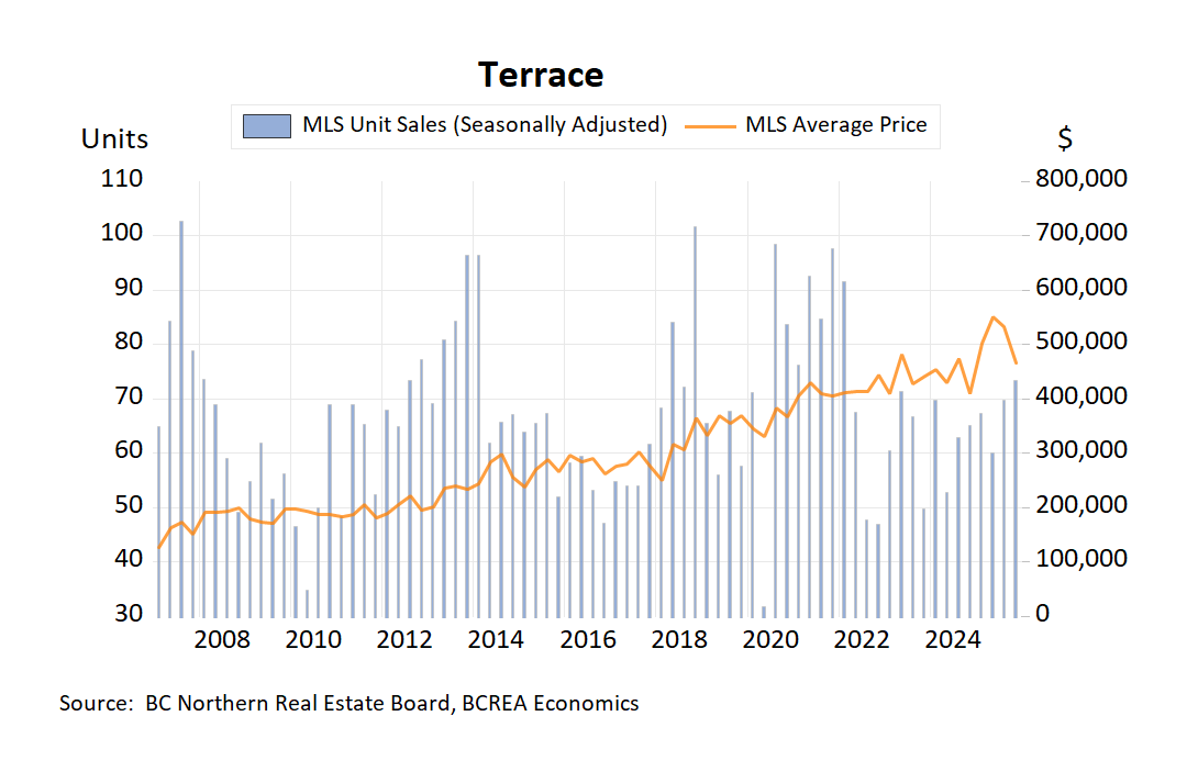 Terrace: 290 properties sold in 2025 were worth $152.3 million compared with 2024’s 274 properties worth $120.1 million. Of the 159 single-family homes that changed hands, half sold for less than $545,000. In addition, 15 parcels of vacant land, 33 homes on acreage, 16 manufactured homes in parks and 11 manufactured homes on land sold in 2025. As of December 31st, there were 129 properties of all types available through MLS® in the Terrace area, up from the 117 properties available at December 31, 2024.
