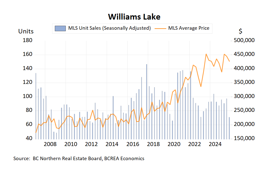 Williams Lake: 393 sales worth $165 million were reported through MLS® in 2025, down from 423 sales worth $184.9 million the previous year. Half of the 130 single-family homes sold in 2025 sold for less than $496,500. 29 parcels of vacant land, 82 homes on acreage, 31 townhouses, 41 manufactured homes in parks and 38 manufactured homes on land were also sold in 2025. At the end of December, there were 186 properties of all types available through MLS® in the Williams Lake area, up from the 133 properties at the same time last year.
