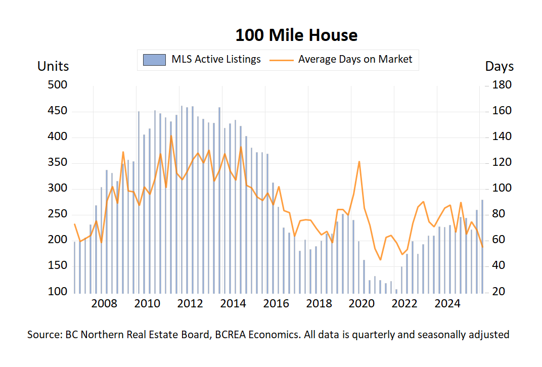 100 Mile House: 420 properties worth $188.4 million sold this year through MLS®, compared with 374 properties worth $175.1 million in 2024. The 125 single-family homes that sold in 2025 had a median value (half sold for less) of $515,000. In addition, 110 parcels of vacant land, 101 homes on acreage, 30 manufactured homes on land, 9 manufactured homes in parks, and 19 recreational properties changed hands in 2025. At the end of December, there were 278 properties of all types available for sale through MLS® in the 100 Mile House area, up from the 258 properties at the end of 2024.
