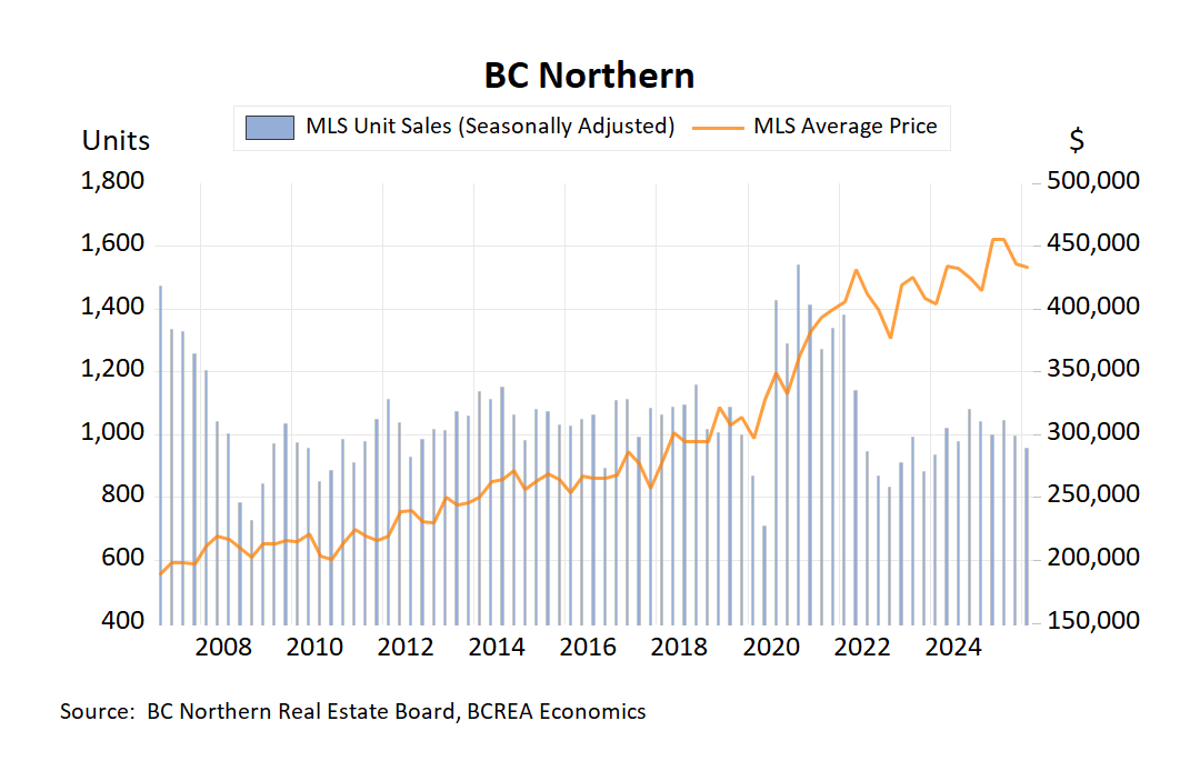 Sales in the BC Northern region in the fourth quarter of 2025 ticked downward from a close-to average previous quarter. At 1,008 sales on a seasonally adjusted basis, housing market activity was 4.2 per cent below historical averages and 7.2 per cent below the level of Q4 2024. With 1,811 active listings at the end of December 2025 (seasonally adjusted), the region remains about 30 per cent below what we consider healthy long-term levels of inventory. The average sale price in the board area fell to $436,495, 4.2 per cent below the previous quarter.