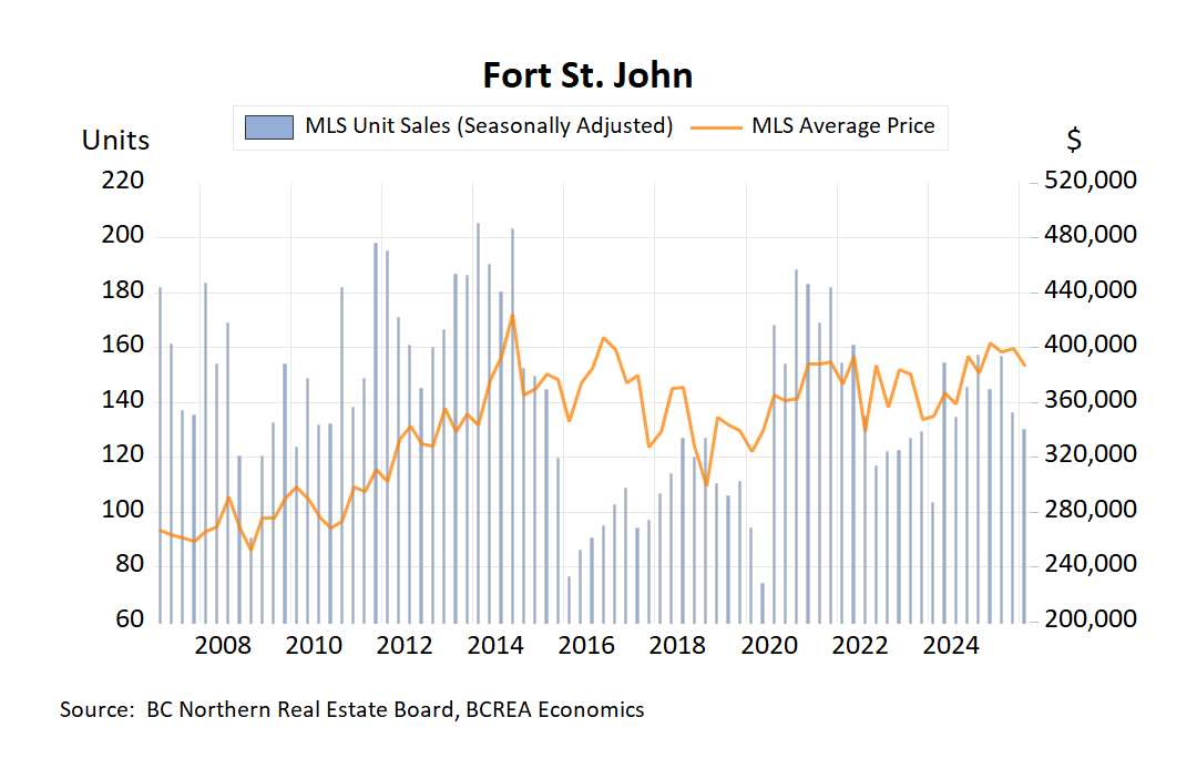In Fort St. James 52 properties worth $13.6 million sold in 2025, compared to 54 properties worth $15 million in 2024. At year-end, there were 38 properties of all types available through MLS® in the Fort St. James area, compared to 36 at the same time last year.