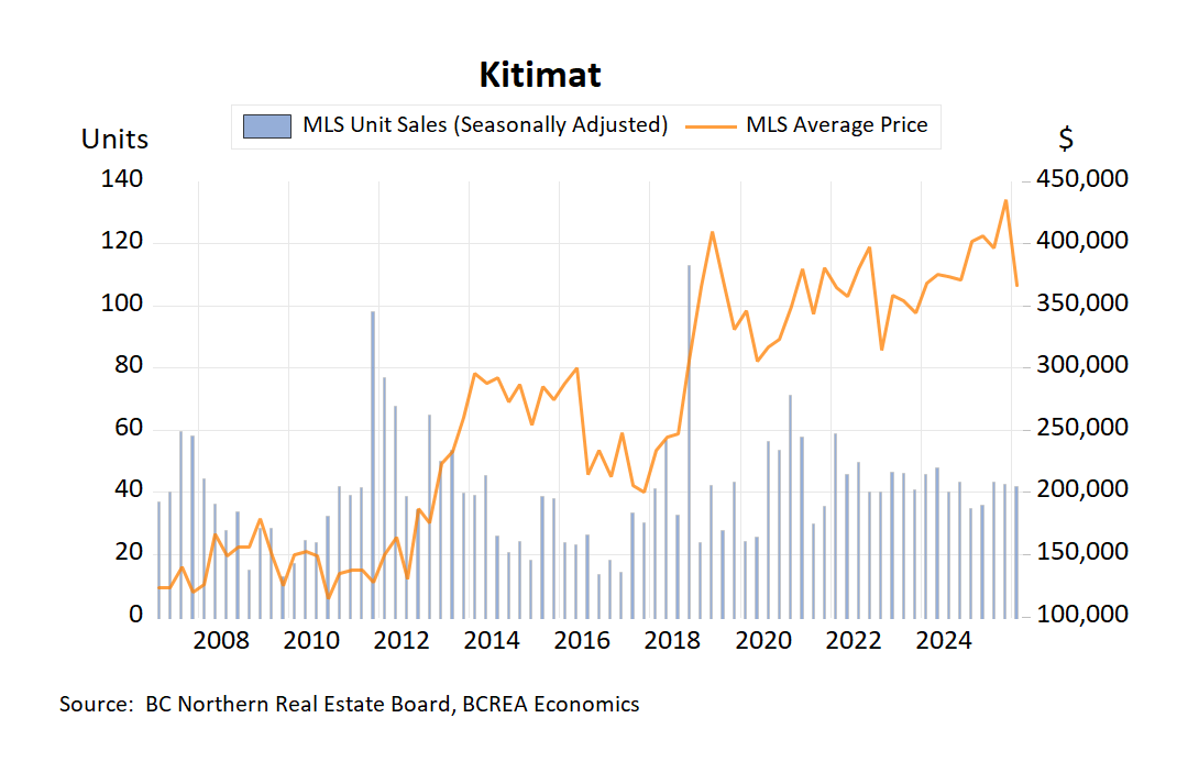 Kitimat: 164 properties worth $68.1 million changed hands in 2025 compared with 183 properties worth $67.6 million in 2024. The median value of the 122 single-family homes sold in 2025 was $419,500. In addition, 14 half-duplexes and 7 townhouses were sold. At year-end, there were 81 properties of all types available in the Kitimat area, which is down from 89 at December 31, 2024.