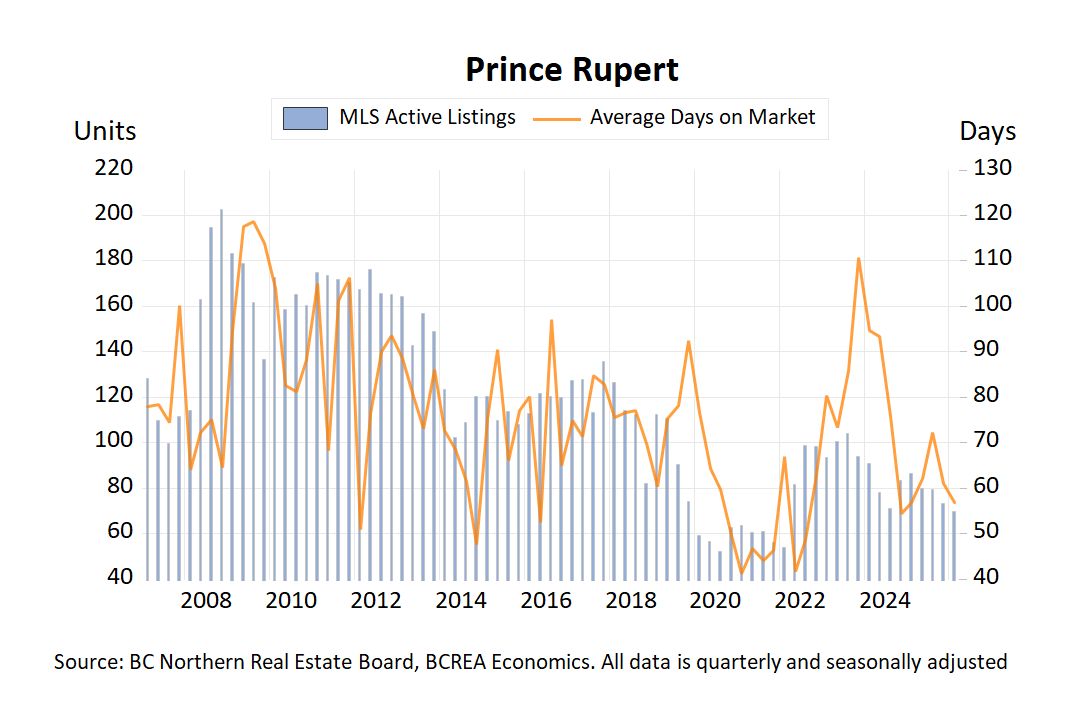 Prince Rupert: 159 properties worth $68.3 million changed hands in 2025 compared with 166 properties worth $65.4 million in 2024. Half of the 114 single-family homes sold in 2025 sold for less than $445,000. In addition, 10 parcels of vacant land, 4 homes on acreage, and 6 half-duplexes sold in 2025. At year-end, there were 121 properties of all types available through MLS® in the Prince Rupert area, up slightly from the 119 properties at the same time last year.
