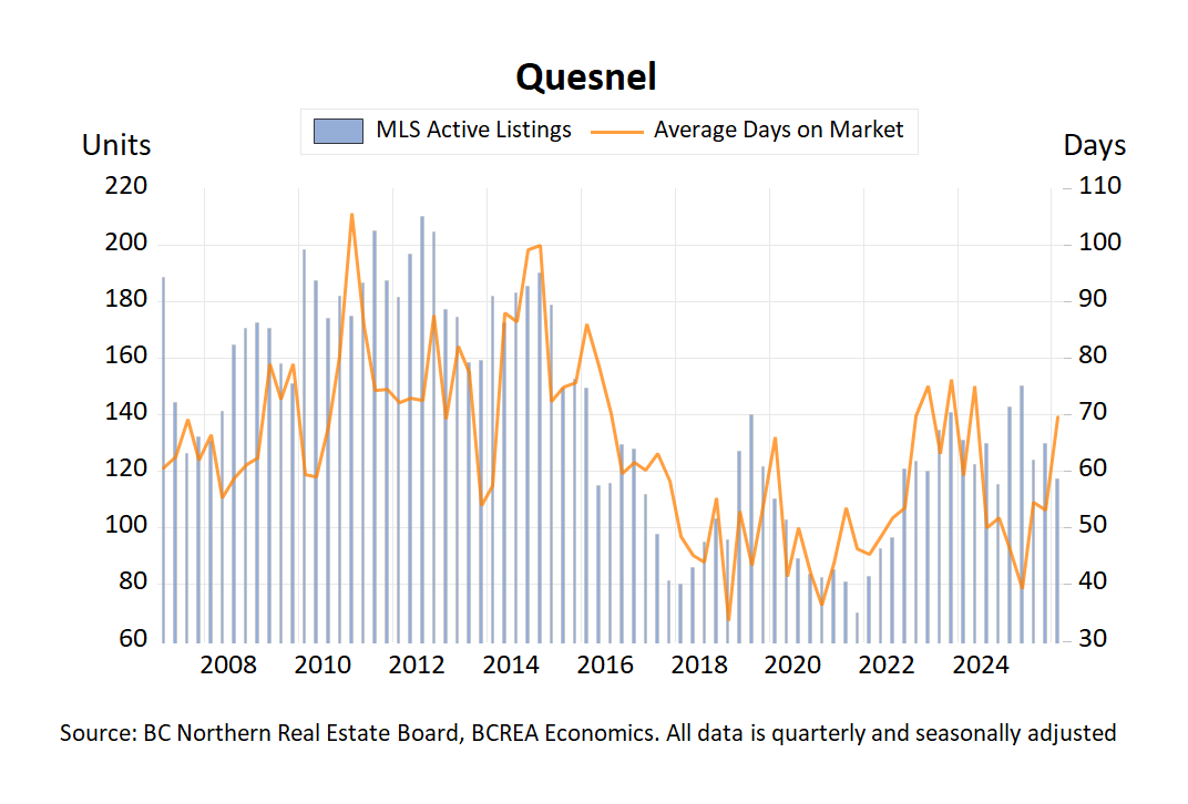 Quesnel: 345 properties changed hands in 2025 through MLS®, up from 313 that were sold in 2024. The value of these properties was $118.2 million ($112.8 million in 2024). The median value of the 120 single-family homes sold in 2025 was $375,000. In addition, 58 parcels of vacant land, 67 homes on acreage, 31 manufactured homes in parks and 39 manufactured homes on land were reported sold in 2025. At year-end, there were 162 properties of all types available for purchase through MLS® in the Quesnel area, up from 132 properties at the end of 2024.