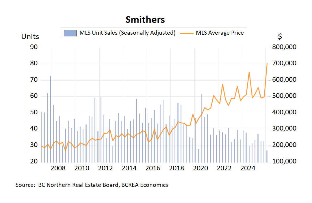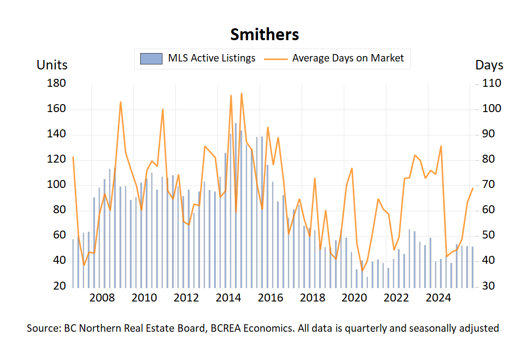 Smithers: REALTORS® reported 161 sales worth $85.9 million in 2025, compared to 160 sales worth $82.2 million in 2024. The median value of the 66 single-family homes that sold in 2025 was $517,500. 18 parcels of vacant land, 37 homes on acreage, 15 manufactured homes in parks and a further 4 on land also changed hands in 2025. At year-end, there were 80 properties of all types available in the Smithers area, compared with 53 at December 31, 2024.