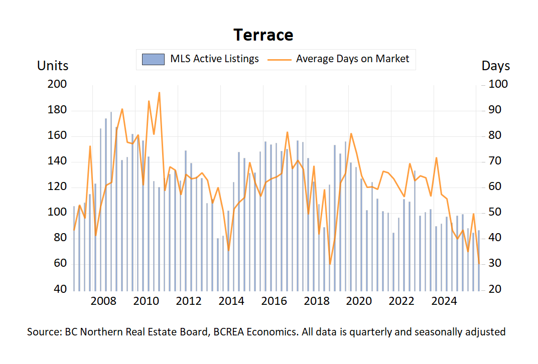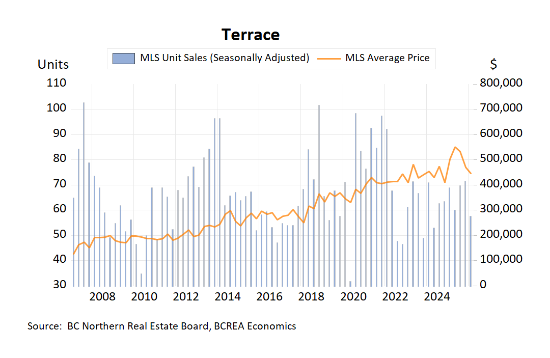 Terrace: 290 properties sold in 2025 were worth $152.3 million compared with 2024’s 274 properties worth $120.1 million. Of the 159 single-family homes that changed hands, half sold for less than $545,000. In addition, 15 parcels of vacant land, 33 homes on acreage, 16 manufactured homes in parks and 11 manufactured homes on land sold in 2025. As of December 31st, there were 129 properties of all types available through MLS® in the Terrace area, up from the 117 properties available at December 31, 2024.