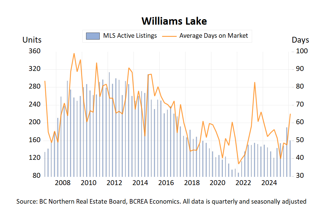 Williams Lake: 393 sales worth $165 million were reported through MLS® in 2025, down from 423 sales worth $184.9 million the previous year. Half of the 130 single-family homes sold in 2025 sold for less than $496,500. 29 parcels of vacant land, 82 homes on acreage, 31 townhouses, 41 manufactured homes in parks and 38 manufactured homes on land were also sold in 2025. At the end of December, there were 186 properties of all types available through MLS® in the Williams Lake area, up from the 133 properties at the same time last year.